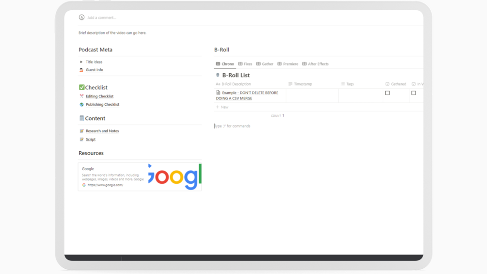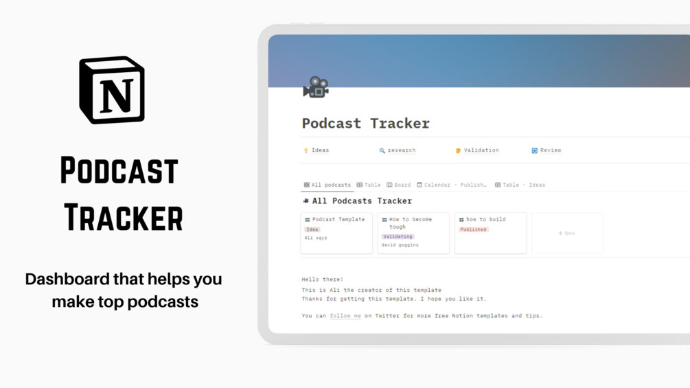 This template is made to level up your podcast quality. I've spent a lot of time making a place where you can put anything related to the podcast in it. No need for 100 other apps to manage it.